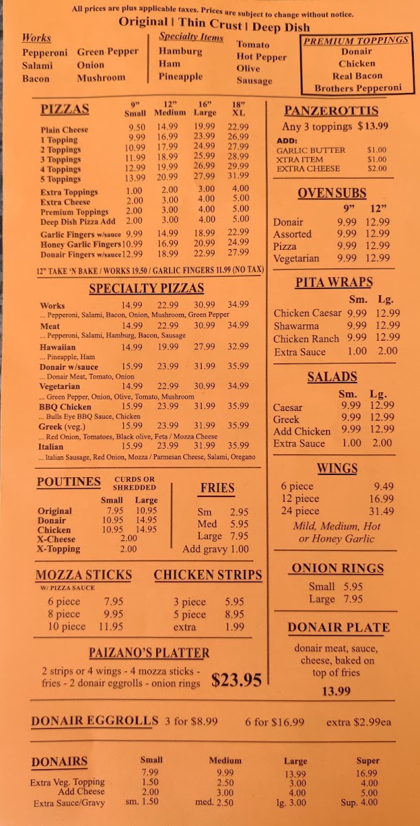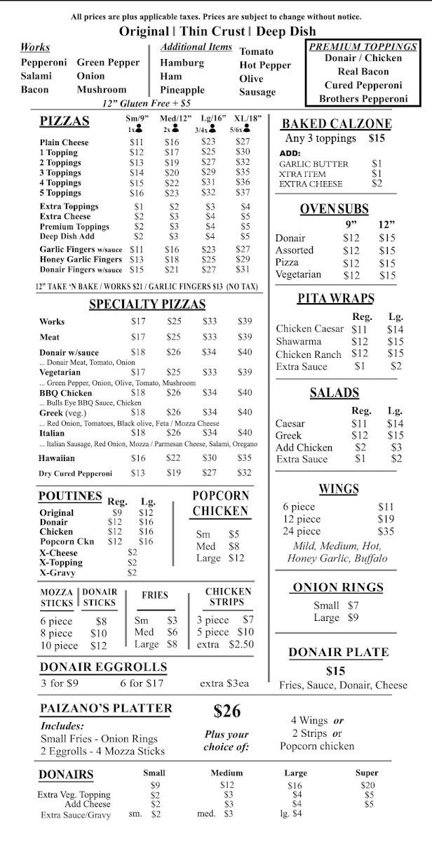 Paizano's Pizzeria & Donair offers a diverse menu, catering to a variety of tastes. Their Pizzas include simple options like Plain Cheese and customizable choices such as 1 Topping and 2 Toppings, perfect for those who enjoy a personalized pie. For something a bit different, their Garlic Fingers and Honey Garlic Fingers are savory, tempting sides. The Oven Subs feature several hearty options, including the classic Donair, the flavorful Assorted, and the unique PizzaVegetarian. If you're looking for a more specialized pizza, their Specialty Pizzas are a must-try, with options like the fully loaded Works, the meaty Meat, the flavorful Donair W/SauceVegetarian, and the tangy Bbq Chicken. For a lighter meal, Pita Wraps are a delicious choice, with favorites like Chicken Caesar, Shawarma, and Chicken Ranch, all of which can be customized with Extra Sauce. If you're in the mood for something fresh, their Salads include the classic Caesar and the Mediterranean-inspired Greek. Rounding out the menu are other tempting choices like the Original and Chicken varieties, ensuring there's something for everyone at Paizano's. Whether you're in the mood for pizza, a wrap, or a salad, the restaurant’s menu promises satisfying meals at great prices.